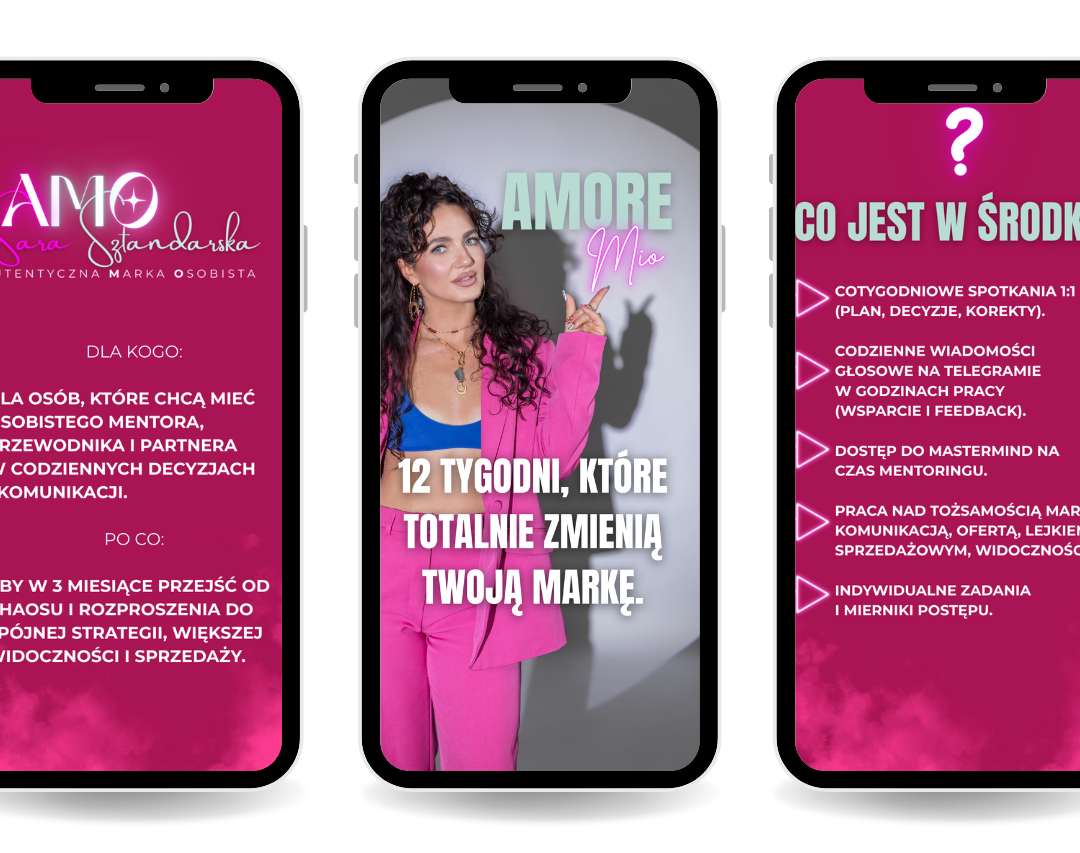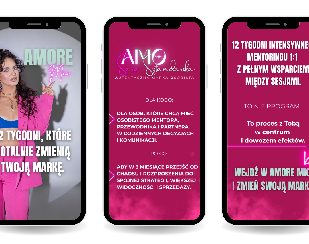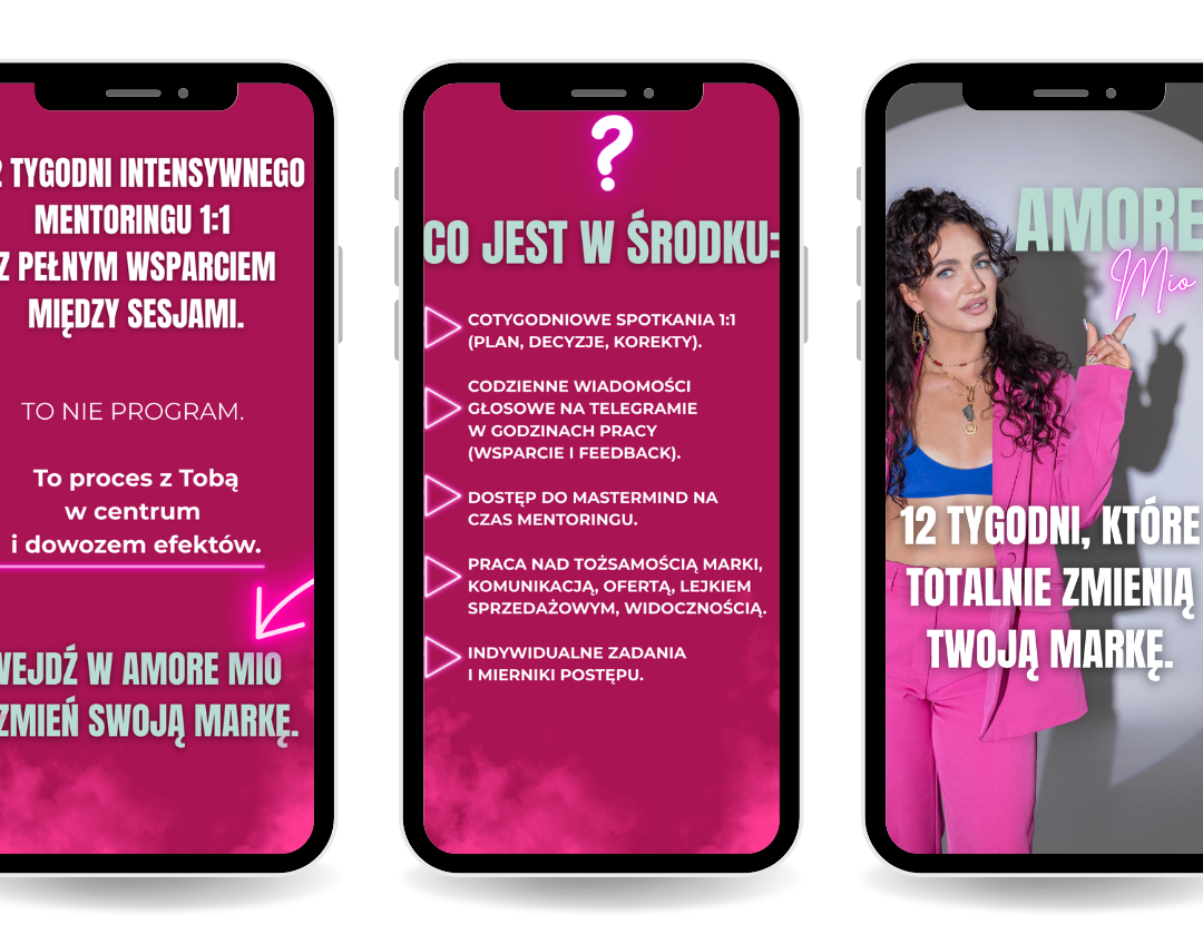 AMORE MIO to mentoring, który pracuje z Tobą codziennie. Twoja marka przestaje być planem. Zaczyna być systemem, który działa, sprzedaje i odzwierciedla Ciebie.